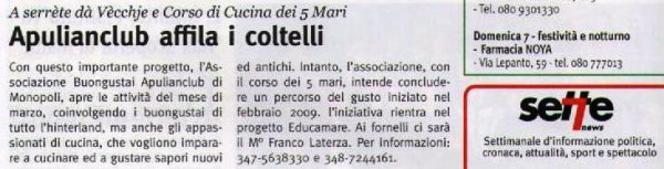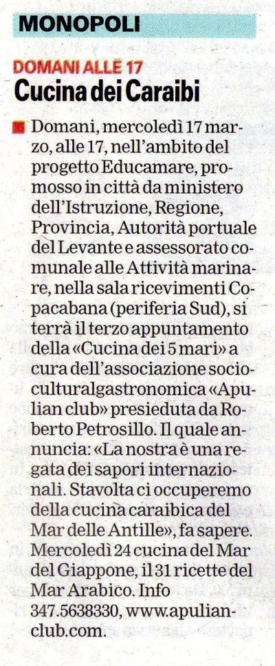 Il 3 Marzo 2010 i battenti delle cucine dei Saloni per Ricevimento “Copacabana” di Monopoli si aprono ai 23 fortunati partecipanti al Corso di Cucina dei 5 Mari, organizzato e diretto dall’Associazione Buongustai APULIANCLUB. LEGGI IL RESTO