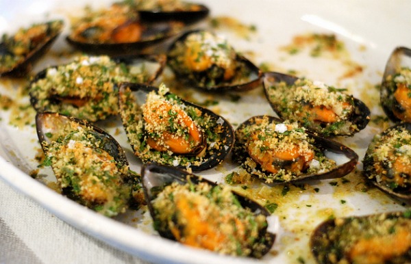 Fare aprire le cozze mettendole in una padella sul fuoco con un po’ d’olio. Una volta aperte privarle di una valva mantenendo il frutto nell’altra. Mescolare pane grattugiato, formaggio e aglio triturato, regolare di sale e pepe e bagnare con vino bianco. Con l’impasto ricoprire ogni cozza, quindi disporre tutte le cozze preparate in una teglia da forno in maniera da non sovrapporle. Irrorare con un filo d’olio e cuocere finchè l’impasto sarà evidentemente croccante.