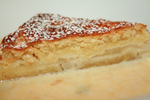 In un robot da cucina mettere tutti gli ingredienti e impastare bene, prendere l’impasto avvolgere in pellicola da cucina e far riposare in frigorifero per 2 ore circa. Pelare le pere, togliere il torsolo e tagliarle in fette sottili. Imburrare una teglia 20x30cm con burro, passare la farina e mettere in frigo per alcuni minuti. Coprire il fondo della teglia con uno strato sottile di pasta di mandorle, coprire con uno strato di pere ben allineate e ricoprire con un’altro strato di pasta di mandorle. Spennellare con uovo sbattuto e infornare a 160°C per 25/30 minuti circa o fino a quando avrà assunto un bel colore dorato. Lasciare raffreddare per bene dopodiché tagliare a piacere.